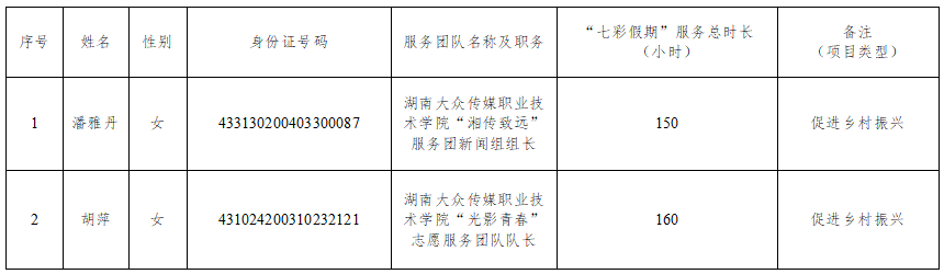 根据《湖南省2025年青年志愿者服务农村留守儿童“七彩假期”志愿服务项目表扬名单遴选申报的通知》有关要求,经团队及学生本人申请、校团委推荐团省委审核,现对入选湖南省“七彩假期”成绩突出志愿服务团队、志愿者的名单予以公示: